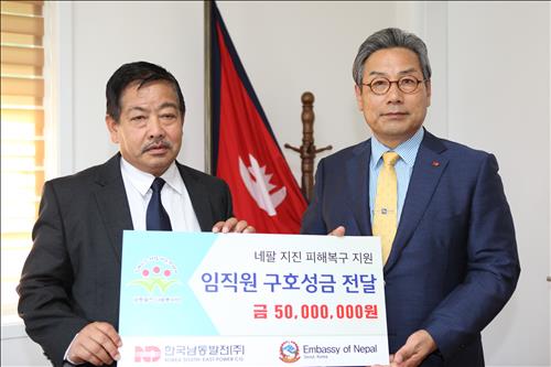 (서울=연합뉴스) 이웅 기자 = 한국남동발전이 지진으로 피해를 본 네팔에 대한 구호 지원을 위해 임직원들이 모금한 5천만원의 성금을 주한 네팔 대사관에 전달했다고 21일 밝혔다.