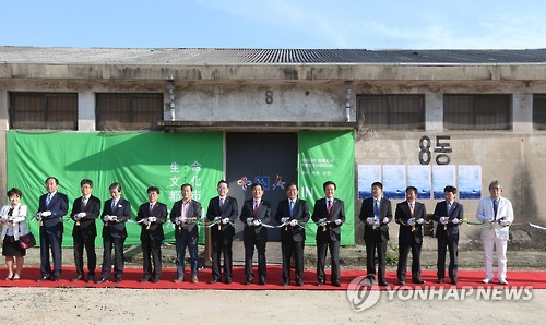 | △ 동아시아문화주간 개막식 행사 열려 (청주=연합뉴스) 21일 오후 옛 연초제조창 동부창고에서 이승훈 시장 등 시민들이 참석한 가운데 화려한 2015 동아시아문화주간 행사 개막식이 열렸다. 사진은 참석자들이 테이프 커팅을 하는 모습. (청주시 제공) |