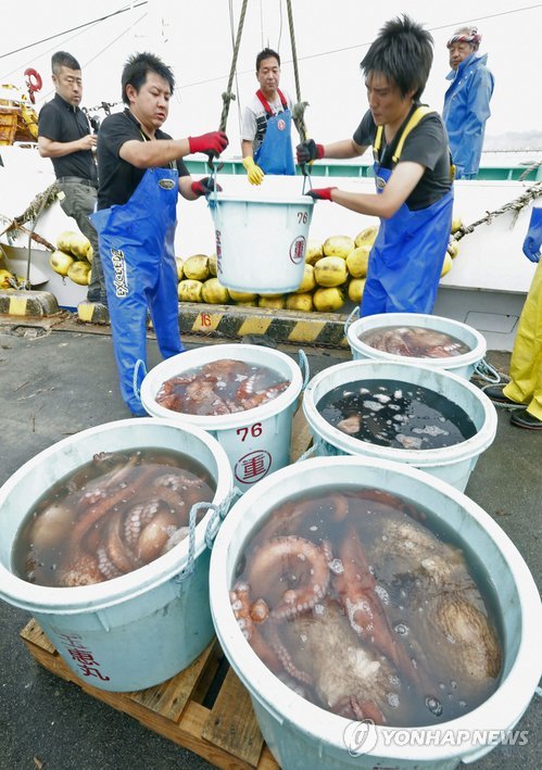 | △ 일본 후쿠시마현 북부의 소마후타바(相馬雙葉)어업협동조합 어민이 조업을 마치고 문어 등 어획물을 옮기고 있다. (교도=연합뉴스 자료사진) |