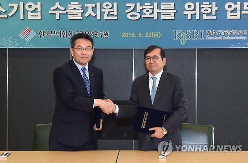 (서울=연합뉴스) 이웅 기자 = 한국무역협회 국제무역연구원이 22일 서울 삼성동 트레이드타워에서 중소기업연구원과 중소기업에 대한 수출 지원을 강화하기 위한 업무협약(MOU)을 맺었다.