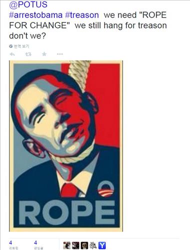 지난 18일 오바마 대통령이 "안녕 트위터! 버락이에요. 진짜로!!"라는 첫 글을 올리자마자 달린 댓글 중에는 오바마 대통령이 목에 올가미를 건 채 눈을 감고 목을 옆으로 늘어뜨린 그림도 있었다.