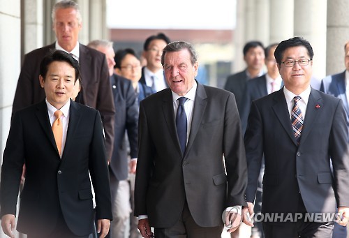 | △ 경기도 방문한 슈뢰더 전 독일 총리 (수원=연합뉴스) 신영근 기자 = 22일 오전 경기도 수원 경기도청을 찾은 독일의 슈뢰더 전 총리(가운데)가 경기도의회에서의 특별 연설을 위해 남경필 경기도지사(왼쪽), 이기우 부지사와 함께 도의회로 향하고 있다. 2015.5.22 drops@yna.co.kr http://blog.yonhapnews.co.kr/geenang |