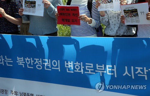 | △ 대학생·청년단체 대표, 위민크로스DMZ행사 비판 기자회견 (서울=연합뉴스) 전수영 기자 = 6개 대학생·청년단체 대표들이 21일 오전 서울 청계광장에서 세계여성평화운동가들이 오는 24일 비무장지대(DMZ)를 걸어서 건너는 '위민크로스DMZ'(WCD) 행사를 비판하는 기자회견을 하고 있다. 참가자들은 위민크로스DMZ(WCD)측에 북한의 핵개발 포기와 인권개선 노력에 대하여 언급하라고 강조하며 진정한 한반도의 평화와 통일을 위한 공개토론회를 제안했다. 2015.5.22 swimer@yna.co.kr |