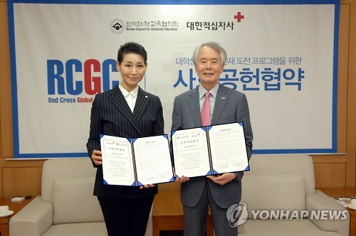 (서울=연합뉴스) 오예진 기자 = 대한적십자사(한적)는 22일 서울 적십자 본사에서 한국대학교육협의회와 '대학생 글로벌인재 도전 프로그램'(RCGC) 협약을 체결했다고 밝혔다.