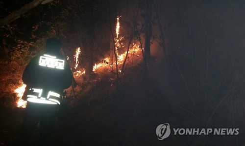 | △ 대전 식장산 산불 (대전=연합뉴스) 22일 저녁 대전 동구 식장산 고산사 인근에서 불이 나 소방 관계자가 진화 작업을 하고 있다. 2015.5.22 << 독자 제공 >> walden@yna.co.kr |