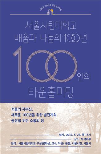 서울시립대는 28일 학교 내 자작마루에서 원윤희 총장을 비롯한 교수진과 학생, 교직원 등 학교 구성원과 동문, 서울시와 시의회, 시민단체, 지역 주민 등이 모이는 '100인의 타운홀 미팅'을 연다고 25일 밝혔다.