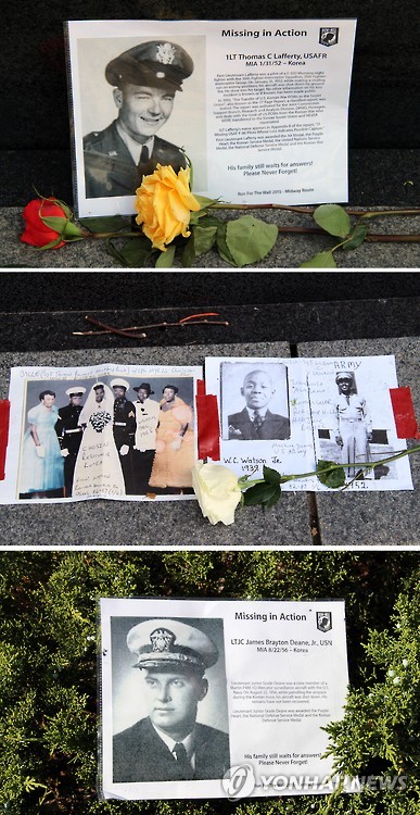 한국전쟁 당시 실종된 미군 병사의 가족들이 미국 메모리얼 데이인 25일(이하 현지시간) 워싱턴DC 한국전 참전 기념공원 주변에 놓은 전단들이다.