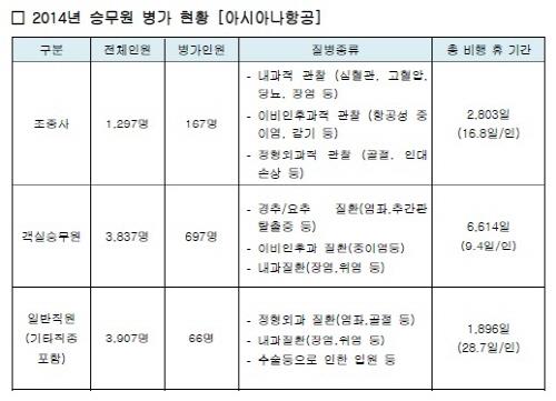 26일 이기일 항공정책연구소 소장이 최근 발표한 '국제선항공승무원의 노동환경과 국외근로비과세 공평성 연구' 논문과 아시아나항공 자료에 따르면 지난해 아시아나항공 객실 승무원 3천837명 가운데 18%인 697명이 병가를 냈다.