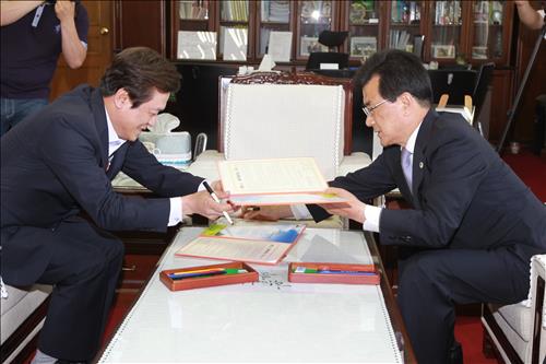 두 사람은 집무실에서 오는 9~10월 괴산에서 열리는 세계 유기농 산업엑스포를 주제로 25분간 환담하고 엑스포 성공 개최를 위한 업무 협약에 서명했다.