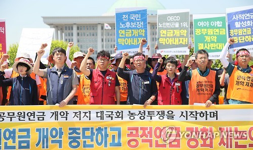 민주노총은 이날 오후 국회 앞에서 기자회견을 열어 "여야 대표는 이달 초 앞으로 5년 동안 보험료는 29% 인상되고 보장성은 10.5% 떨어지는 내용 등을 담은 공무원연금안에 합의했다"며 "재정절감이라는 목표 아래 국가 책임은 회피하고 교사·공무원 등 이해당사자들의 희생을 강요한 개악안"이라고 주장했다.
