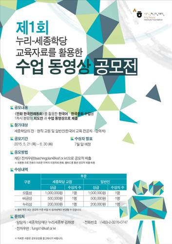 재단 관계자는 "세종학당의 학습 품질을 높이기 위해 현장의 교육 우수 사례를 공모하기로 했다"며 "수상작은 온라인 사이트에 올려 교육 참고 자료로 활용할 계획"이라고 소개했다.