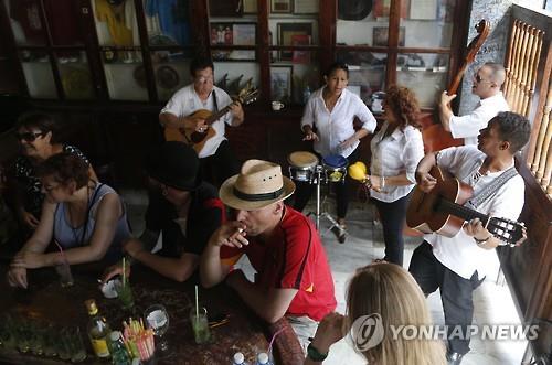 | △ 24일(현지시간) 쿠바 아바나를 찾은 관광객들이 노벨문학상 작가 어니스트 헤밍웨이가 즐겨찾았던 바에서 모히토 등 음료를 즐기고 있다.(AP=연합뉴스) |