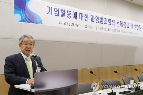 권태신 한경연 원장은 "국민의 22%, 15세 이상인 경우 26.5%가 전과자로, 인원수를 누계하면 1천100만명에 이르는 실정"이라며 "게다가 무리한 검찰수사나 섣부르게 기업을 잠재적 범죄집단으로 낙인찍는 과잉범죄화 때문에 '경제치사'도 우려되는 상황"이라고 밝혔다.