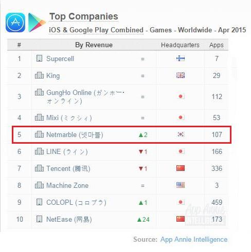 (서울=연합뉴스) 고상민 기자 = 넷마블게임즈는 글로벌 모바일 앱 통계 분석 사이트 '앱 애니'가 발표한 전 세계 모바일 게임 4월 매출 순위(구글플레이-앱스토어 통합)에서 5위를 기록했다고 27일 밝혔다.