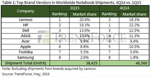 레노버와 HP에 이어 델이 13%의 점유율로 3위 자리를 지켰고 대만의 에이수스와 에이서가 각각 10.4%와 9.9%의 점유율로 4위와 5위에 올랐다.