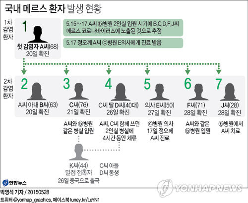 추가 환자는 국내 최초 메르스 환자 A(68)씨와 같은 병동에 있던 환자와 의료진이다. 이로써 국내 메르스 감염 환자는 첫 환자 발생 이후 8일만에 7명으로 늘었다.