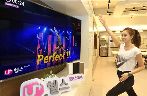 (서울=연합뉴스) 한지훈 기자 = LG유플러스[032640]는 28일 스마트폰을 한 손에 들고 텔레비전 영상을 따라 움직이면서 운동할 수 있는 홈 피트니스 서비스 'U+핏댄스코치'를 출시했다.