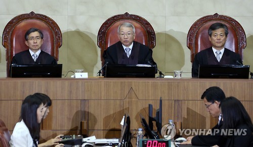 | △ 대법 '산별노조 집단 탈퇴' 적법 여부 공개변론 (서울=연합뉴스) 홍해인 기자 = 양승태 대법원장(가운데)이 28일 오후 서울 서초동 대법원 대법정에서 열린 '발레오전장 금속노조 탈퇴 사건'에 대한 대법원 전원합의체 공개변론을 주재하고 있다. 이날 법정에서는 산업별 노동조합의 산하지부가 스스로 상급 노조를 탈퇴해 기업별 노조로 조직형태를 변경하는 것에 대한 적법성 여부에 대한 원고와 피고 측의 변론이 이어졌다. |