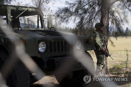 | △ 지난 22일(현지시간) 마약조직원과 교전으로 43명의 사망자가 발생한 멕시코 미초아칸 주의 한 목장 울타리에서 군이 경계를 서고 있다.(AP=연합뉴스DB) |