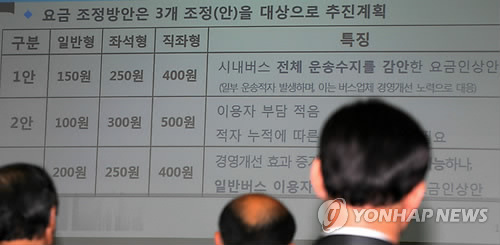 1안은 일반형 150원, 좌석형 250원, 직행좌석형 400원을 각각 인상하는 내용이다.