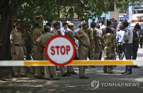 | △ 29일 인도 뉴델리 인디라간디 국제공항 화물터미널 입구에서 경찰이 출입을 통제하고 있다. 이날 터키항공에 온 화물에서 방사성 물질이 유출됐다.(AP=연합뉴스) |