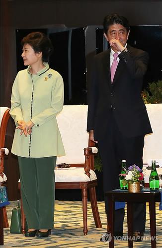 | △ 2013년 10월7일 인도네시아 발리에서 열린 아시아ㆍ태평양경제협력체(APEC) 정상회의에서 박근혜 대통령과 아베 신조 일본 총리가 나란히 서 있는 모습. |