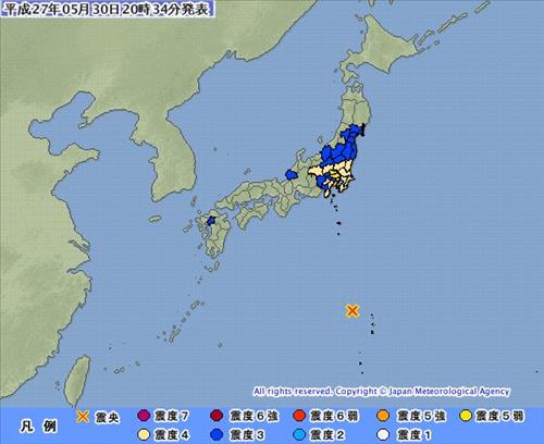 (도쿄=연합뉴스) 이세원 특파원 = 30일 오후 8시 24분께 일본 도쿄도(東京都) 남부의 북태평양에 있는 오가사와라(小笠原)제도 인근에서 규모 8.5(추정치)의 강한 지진이 발생했다.