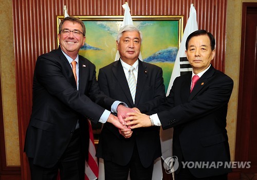 | △ 한자리에 모인 한-미-일 국방장관 (서울=연합뉴스) 싱가포르에서 열린 제14차 아시아안보회의(샹그릴라 대화)에 참석 중인 한민구 국방부 장관(오른쪽)이 30일 애슈턴 카터 미국 국방장관(왼쪽), 나카타니 겐(中谷元) 일본 방위상과 회담에 앞서 악수하고 있다. 2015.5.30 << 국방부 제공 >> photo@yna.co.kr |