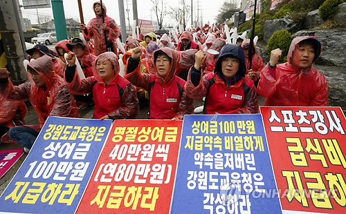 | △ 전국 학교비정규직 노동조합 강원지부 노조원들이 지난달 16일 오후 강원도교육청 앞에서 비를 맞으며 '총파업 궐기대회'를 열고 있다. |