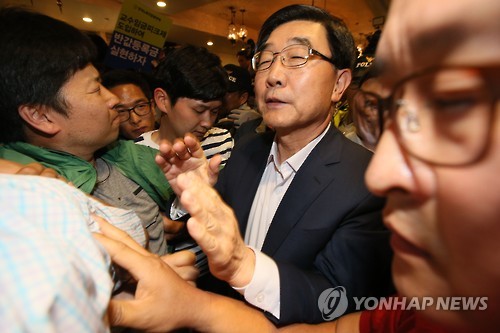 | △ 이기권 고용노동부 장관이 지난 28일 오후 서울 여의도 CCMM빌딩에서 열린 '임금체계 개편과 취업규칙 변경 공청회'에서 축사를 하기 위해 경찰의 보호를 받으며 입장하다 노동조합 관계자들에게 저지당하고 있다. |