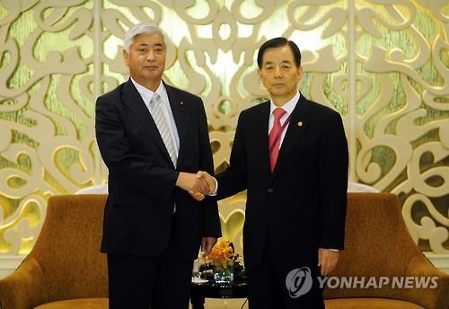 | △ 아시아안보회의(샹그릴라 대화)에 참석한 한민구 국방부 장관이 30일 싱가포르에서 나카타니 겐(中谷元) 일본 방위상과 한일 국방장관 회담에 앞서 악수하고 있다. 2015.5.30 << 국방부 제공 >> |