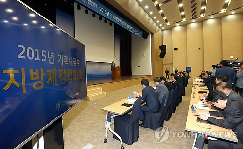 | △ 기획재정부 주최로 지난달 15일 정부세종컨벤션센터(행정지원센터)에서 열린 2015 지방재정협의회에 참석한 17개 시·도 부단체장 및 사업담당 실·국장 등이 송언석 기획재정부 예산실장의 모두 발언을 경청하고 있다. |