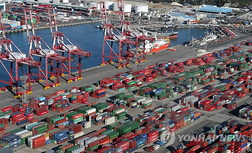 | △ 부산항 신선대부두에 수출입 화물이 쌓여 있는 가운데 대형 크레인이 화물선을 기다리고 있다. (연합뉴스 자료사진) |