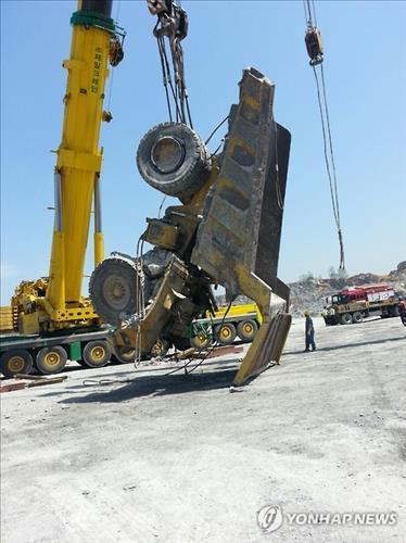 | △ 수직갱도에 매몰됐던 대형 덤프트럭 적재함. <<연합뉴스DB>> |
