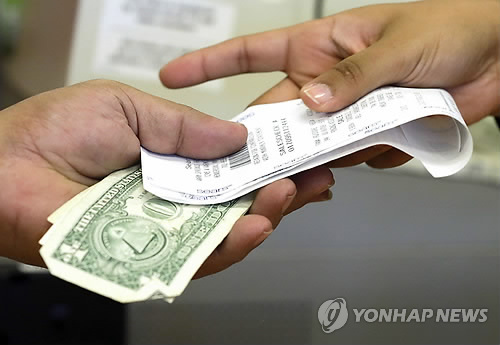 | △ (AP=연합뉴스/자료사진) 2012년 11월 미국 네브래스카 주의 한 소매점에서 계산원이 손님에게 거스름돈과 영수증을 주고 있다. |