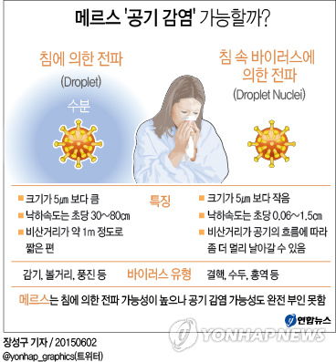 (서울=연합뉴스) 이충원 황윤정 기자 = 중동호흡기증후군(메르스) 환자가 결국 사망에 이르고 3차 감염 환자까지 발생함에 따라 공기에 의한 감염여부가 초미의 관심사로 떠올랐다.