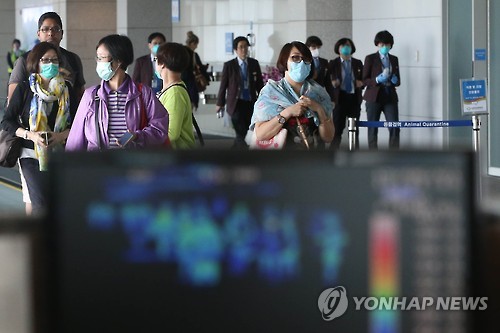 | △ 메르스 불안감 확산...마스크 쓴 외국인들 (서울=연합뉴스) 김주성 기자 = 메르스(중동호흡기증후군) 감염에 대한 불안감이 커지자 1일 인천공항에 도착한 입국객들이 마스크를 쓴 채로 발열 감시 적외선 카메라가 설치된 검역대를 통과하고 있다. 2015.6.1 utzza@yna.co.kr |