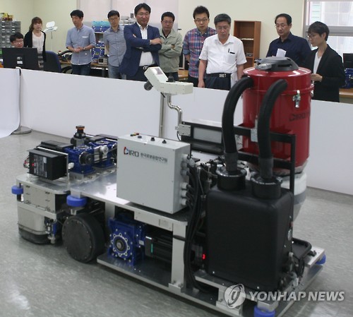 | △ '사람 대신 바닥 시공' (포항=연합뉴스) 한국로봇융합연구원이 ㈜폴라리스와 공동으로 사람 대신 건물 바닥을 연마하고 광택하는 작업을 하는 무인 자동화 콘크리트 폴리싱 로봇을 개발했다. 2015.6.2 << 한국로봇융합연구원 >> shlim@yna.co.kr |