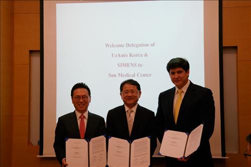 <사진 : 한국지멘스 헬스케어 박현구 대표와 대전 선병원 선승훈 의료원장, 우즈오토 코리아 우마로프 오타벡 부사장(왼쪽부터)이 지난 1일 대전 선병원에서 우즈오토 직원건강검진센터 설립을 위한 양해각서(MOU)를 체결하고 있다.>