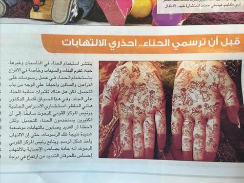 이 신문은 헤나(중동과 인도 등에서 주로 여성이 염료로 그리는 문신의 일종)의 위험성을 우려하는 기사와 함께 한 여성의 양 손바닥을 찍은 사진을 게재했다.
