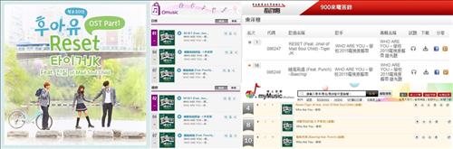 (서울=연합뉴스) 조민정 기자 = KBS 2TV 월화드라마 '후아유-학교2015'(후아유) OST인 타이거JK의 '리셋'이 대만 '오뮤직(Omusic) 케이팝 차트'에서 1위를 차지하는 등 각종 음원 사이트에서 상위권에 진입하며 인기를 증명했다.