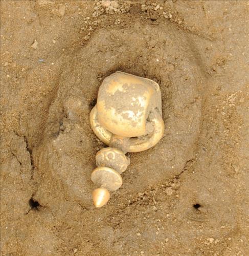 중도 유적 5개 합동 매장문화재 전문조사기관 중 한 곳인 예맥문화재연구원(원장 정연우)은 중도 유적에 대한 2차 조사에서 삼국 시대 소형 돌덧널무덤(石槨墓) 1기를 확인하고, 이에서 금제 굵은고리 귀고리(金製太環耳飾) 1점을 수습했다고 3일 밝혔다.