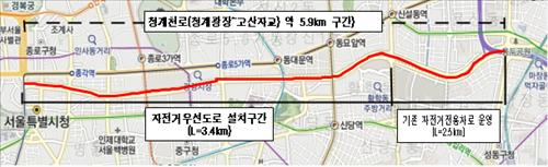 서울시는 7일부터 청계천로의 청계광장부터 청계7가까지 3.4km 구간을 주말과 공휴일마다 '자전거우선도로'로 운영한다고 3일 밝혔다.