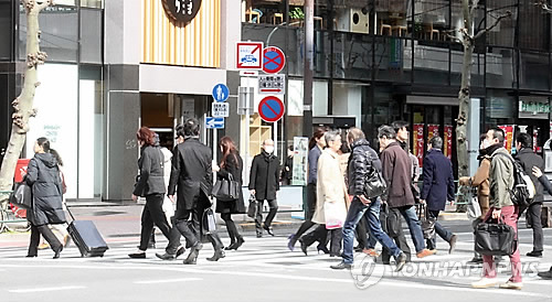| △ 2015년 2월 27일 오후 일본 도쿄도 미나토구의 한 횡단보도에서 행인들이 길을 건너고 있다. |