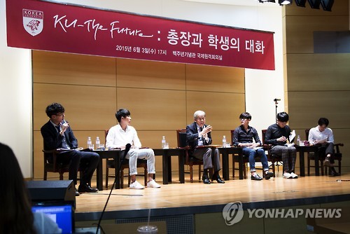 (서울=연합뉴스) 설승은 기자 = 염재호 고려대 총장이 취임 후 처음 학생들과 직접 만나 대화하는 자리에서 등록금 문제가 이념화했다며 연소득에 따른 차별화를 거론했다.