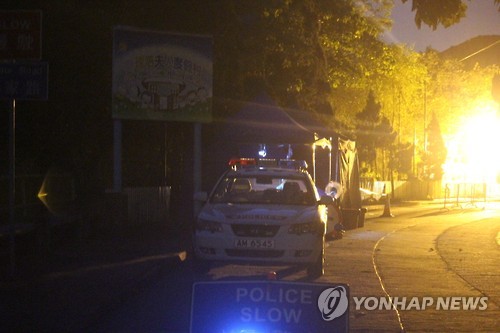| △ 3중 철통경비 속 적막감 감도는 홍콩 메르스 격리시설 (홍콩=연합뉴스) 최현석 특파원 = 2일(현지시간) 메르스 감염 의심자들이 격리된 맥리호스부인 휴양촌 앞을 경찰관과 민중안전복무대 대원, 휴양촌 보안요원들이 3중 철통 경비 서고 있다. 경비견 두마리도 눈에 띄었지만, 지나가는 사람이 한 명도 없어 적막감이 감돌았다. 2015.6.3 harrison@yna.co.kr |