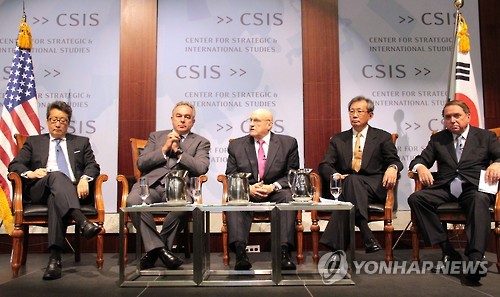 | △ (워싱턴=연합뉴스) 심인성 특파원 = 미국의 동아시아 전문가들이 3일(현지시간) 워싱턴D.C. 싱크탱크인 국제전략문제연구소(CSIS)와 한국국제교류재단(KF) 공동 주최로 CSIS 회의실에서 열린 한미전략대화 세미나에서 한일관계에 대해 언급하고 있다. 사진 왼쪽부터 빅터 차 CSIS 한국석좌, 커트 캠벨 전 미국 동아태 차관보, 리처드 아미티지 전 미 국무부 부장관, 최영진 전 주미대사, 토머스 허바드 전 주한 미국대사. 2015. 6.4 sims@yna.co.kr |