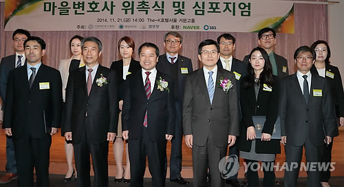 | △ 지난해 11월 서울 서초구 The-K 서울호텔에서 열린 '마을변호사 위촉식 및 심포지엄'에서 참석자들이 마을변호사 위촉장 수여자들과 함께 기념촬영하고 있다. (연합뉴스 자료사진) |