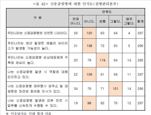 또 전체 직원의 절반에 가까운 49.2%는 '우리나라는 신종감염병에 안전한 나라'라는 명제에 '아니다'(120명) 또는 '전혀 아니다'(26명)라고 답했다.
