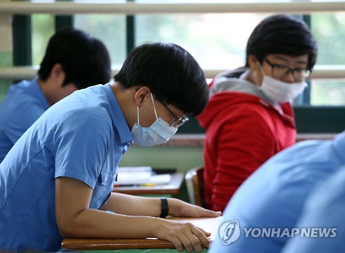 | △ '모의평가 때도 마스크' (서울=연합뉴스) 박동주 기자 = 대학수학능력시험 모의평가가 시행된 4일 오전 서울 종로구 경복고등학교에서 마스크를 쓴 학생이 시험을 준비하고 있다. |
